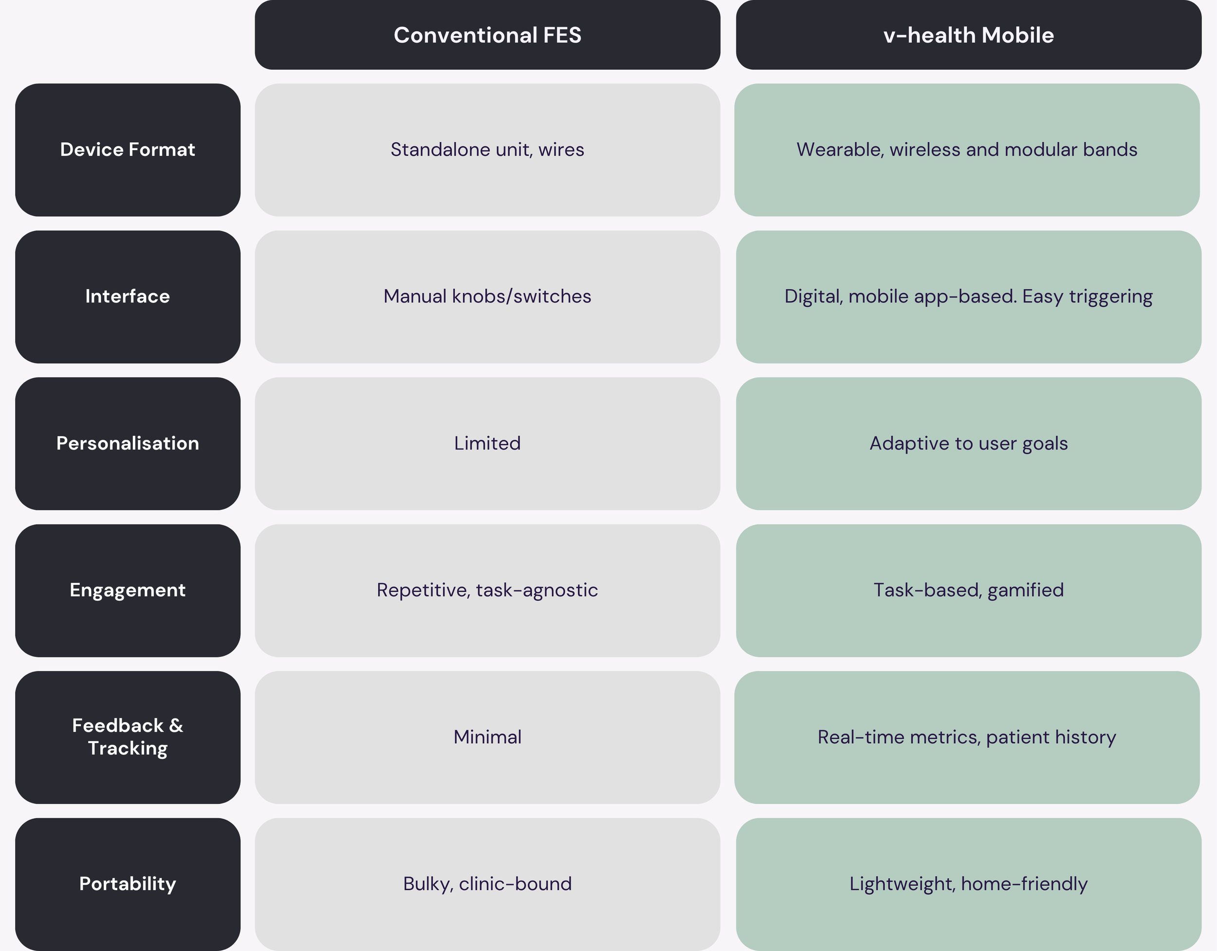 v-health Mobile addresses common challenges with conventional FES by making therapy more functional, engaging, and adaptable.