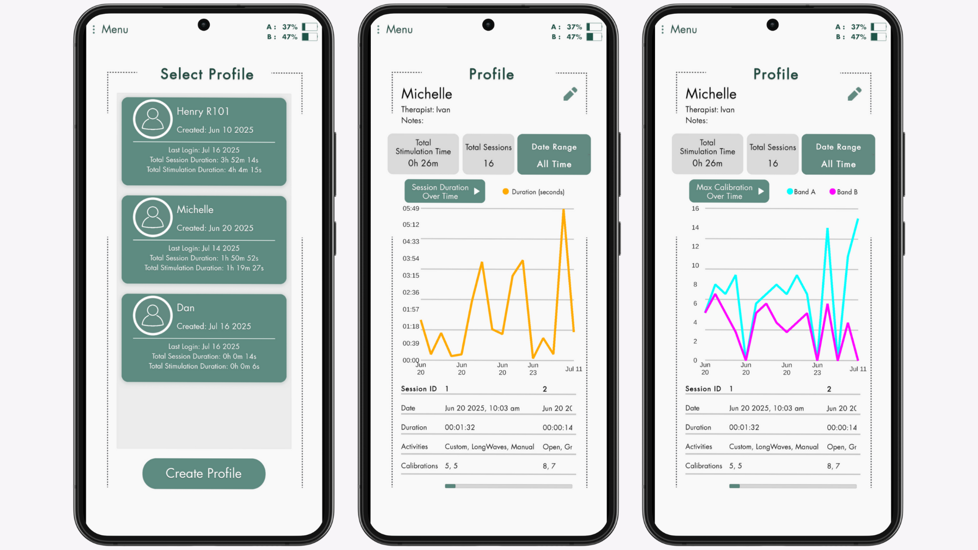 Mobile App Interface: Intuitive app to adjust settings, start sessions, and monitor therapy. Easy for clinicians and patients alike.